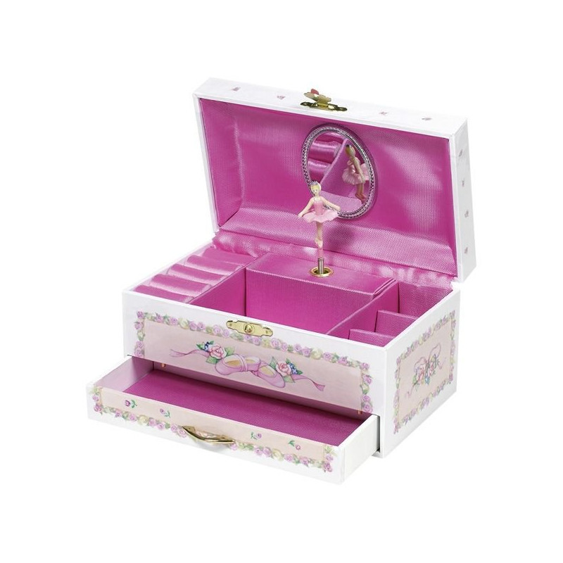 Pięknie wykonane pudełeczko, które jednocześnie jest pozytywką to świetny prezent dla małej dziewczynki. Po otwarciu go ukazuje się baletnica, która obraca się w takt wydobywającej się melodii. W środku jest wiele miejsca na drobiazgi i dodatkowo wyposażona jest w pojemną szufladkę. Na wieczku od wewnątrz zamontowane jest lusterko. Mechanizm pozytywki znajduje się z tyłu i nakręcany jest za pomocą specjalnego kluczyka. Pozytywka jest dedykowana dzieciom powyżej 3 roku życia.