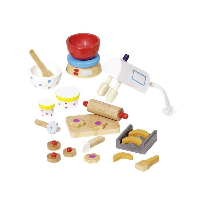 Niezwykłą atrakcją dla dziecka są specjalnie stworzone akcesoria do domków dla lalek. Dzięki nim można odtworzyć prawdziwe życie. Zestaw akcesoriów do kuchni zawiera idealne odwzorowanie miksera z miską, pojemnika na chleb, wagi kuchennej, deski, wałka do ciasta oraz takie elementy jak kubeczki, łyżki, radełko, miseczki czy widelec. Dodatkowo dołączono produkty spożywcze: 3 rogaliki, 3 okrągłe ciastka oraz 3 ciastka w kształcie kwiatków. To doskonałe uzupełnienie zestawu mebli kuchennych i pozwala na stworzenie prawdziwej kuchni dla lalek. Wszystkie elementy wykonano z drewna, a dbałość o każdy szczegół dodaje im uroku. Zabawka dedykowana jest dla dzieci powyżej 3. roku życia.