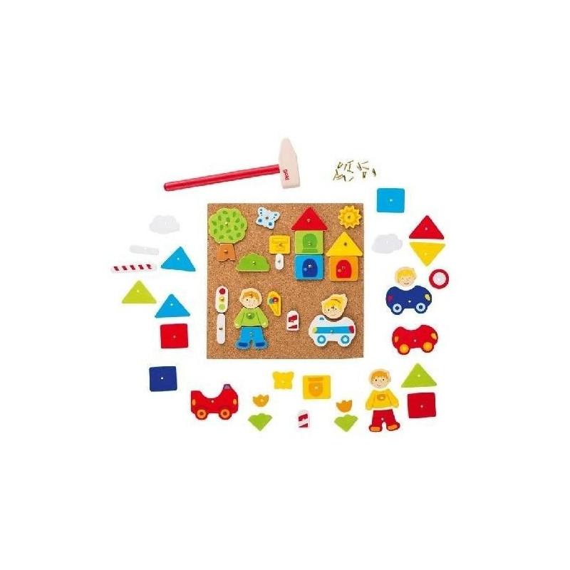 Opakowanie zawiera: planszę korkową, różnokolorowe drewniane elementy z dziurkami, metalowe pinezki do przybijania, drewniany młotek oraz kartę z wzorami.