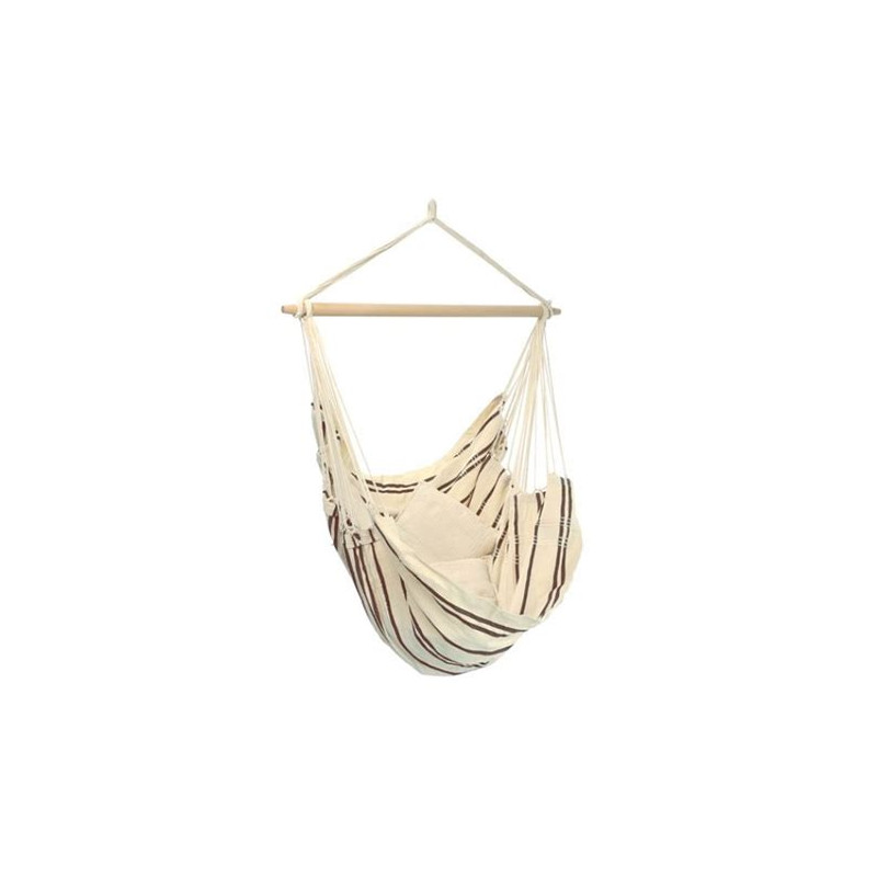 Bujany fotel może być ciekawą atrakcją wykorzystywaną zarówno w domu jak i na dworze. Konstrukcja jest niezwykle stabilna, a naciąg lin zapobiega ześlizgiwaniu się ich w kierunku środka. Poczwórne szwy oraz wytrzymały materiał sprawia, że na tym fotelu może bujać się zarówno dziecko, jak i dorosły. Zawieszony jest on na drewnianym drążku o długości 110 centymetrów oraz grubości 44 milimetrów. Można go bez problemu zamontować na drzewie, specjalnym stojaku lub na haku pod sufitem. Huśtawka ma delikatny beżowy kolor z brązowymi paskami.