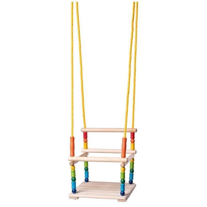 Przedstawiamy Państwu drewnianą huśtawkę marki Woody, dzięki której każde dziecko będzie mogło dotknąć kawałka nieba. To nowa odsłona klasycznej, kolorowej huśtawki, utrzymana w pięknych, tęczowych barwach. Produkt jest całkowicie bezpieczny, oznaczony znakiem CE. Huśtawka ma duże, podwyższane siedzisko tak, by wygodniej było dziecku się huśtać. Drewnianą poprzeczkę z przodu można unieść na sznurkach, aby wygodniej było wsadzić dziecko. Nylonowe liny wykończone metalowymi okuciami.