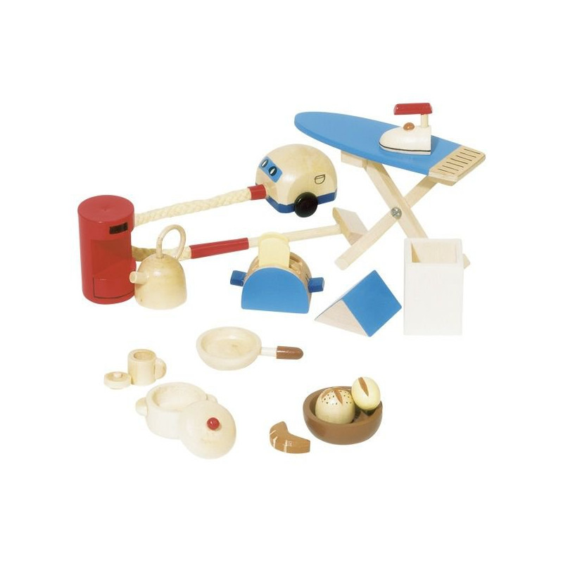 Małe akcesoria, służące do rozbudowy mebli do domku dla lalek są świetnym elementem, dzięki któremu dziecko będzie mogło idealnie odwzorować życie codzienne. Zestaw zawiera aż 19 elementów dla małej gospodyni domowej. Jest to deska do prasowania i żelazko, odkurzacz, kosz na śmieci, patelnia, garnek z przykrywką, czajnik, miska, toster z dwoma grzankami, chlebak, bułki, rogaliki oraz czerwony ekspres do kawy z kubkiem. Dziecko może je ustawić w różnych pomieszczeniach i tym sposobem stworzyć prawdziwe domowe zacisze. Każdy element został stworzony z dbałością o szczegóły. Zabawka dedykowana jest dla dzieci powyżej 3. roku życia.