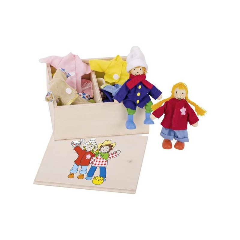 Laleczki do ubierania są elementem dobrej zabawy, ale również pomagają ćwiczyć sprawność rąk dziecka. Zestaw zawiera dwie drewniane laleczki przedstawiające chłopca oraz dziewczynkę, 8 zestawów różnych ubrań i elementy dodatkowe w postaci szalików, kapeluszy, chustek oraz czapek. Dodatkowo dołączone jest drewniane pudełko z przegrodą, zamykane od góry wsuwaną płytką. Ręce i nogi lalek wykonane są ze sznurka, który można dowolnie wyginać. Zabawka dedykowana jest dla dzieci powyżej 3 roku życia.