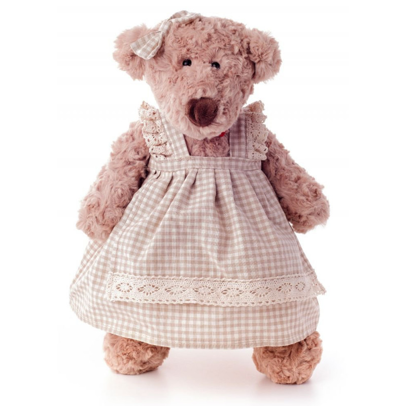 W ślicznej kraciastej sukience i z kokardą na głowie wygląda wprost prześlicznie. Doskonała przytulanka i ładna dekoracja w jednym. Mięciutkie futerko sprawia, że aż chce się ją przytulać bez końca. Oczywiście na szyi misia czerwone filcowe serduszko.