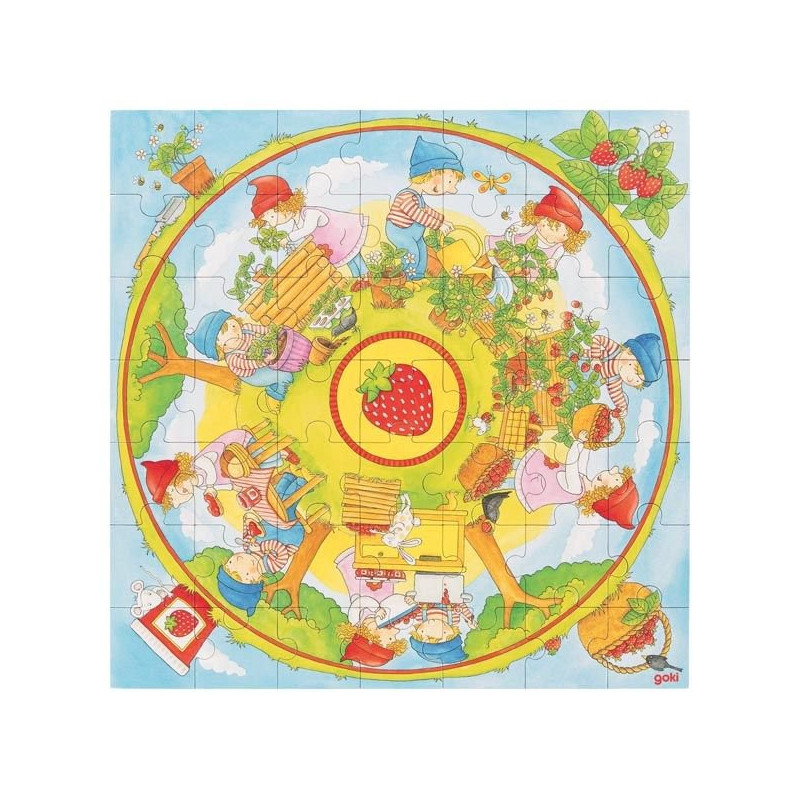 Dookoła dużej truskawki możemy zaobserwować proces robienia dżemu truskawkowego, począwszy od hodowli krzaków z truskawkami, na konsumpcji dżemu skończywszy. Zadaniem dziecka jest ułożyć układankę, by dowiedzieć się jak produkuje się dżem. Układanka rozwija logiczne myślenie, ćwiczy umiejętność dopasowywania.