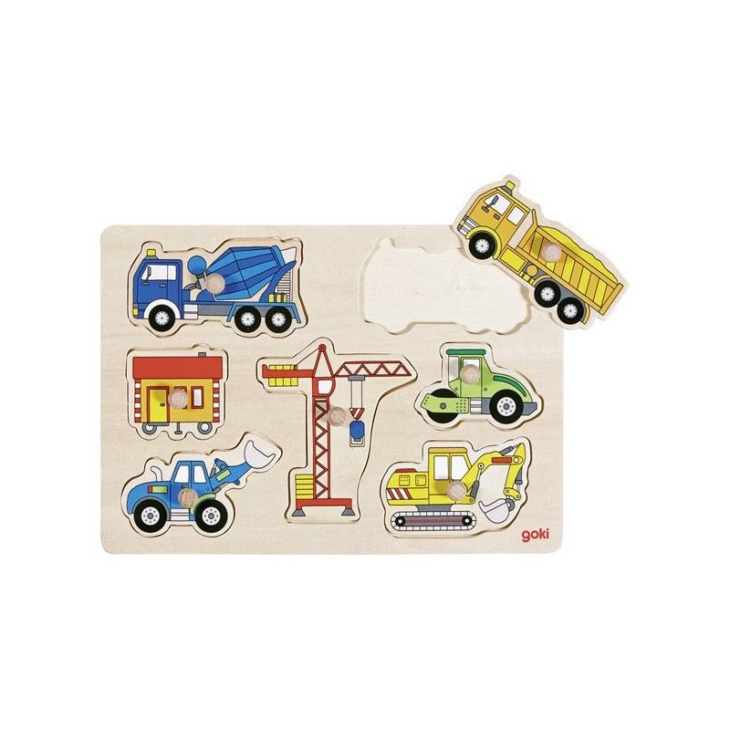 Doskonałą zabawką, która w idealny sposób rozwija małego chłopca jest układanka firmy Goki. Ilustracje umieszczone na drewnianych elementach przedstawiają ciężarówkę, betoniarkę, walec, koparkę, ładowarkę, duży dźwig oraz wagon sypialniany. Zabawa polega na dopasowaniu puzzli do otworów wyciętych w podstawie. Zabawka dedykowana jest dla dzieci powyżej 1 roku życia.