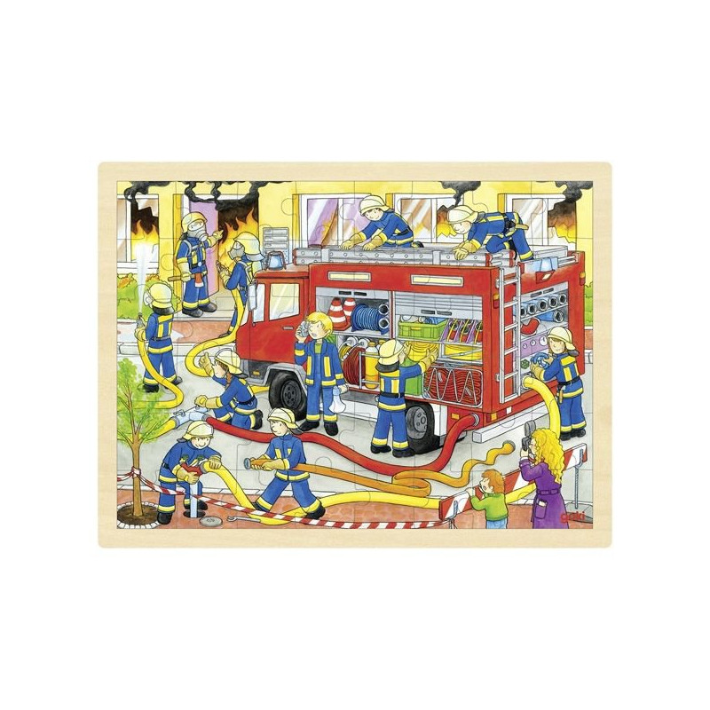 Poprzez układanie obrazków dzieci uczą się logicznego myślenia. Duże puzzle przedstawiające pracę straży pożarnej zawierają ogromną ilość szczegółów. Po ułożeniu można z dzieckiem bawić się w odszukiwanie różnych szczegółów. Zestaw zawiera 48 elementów, które układa się na drewnianej podstawie. Zabawa rozwija cierpliwość oraz spostrzegawczość. Puzzle dedykowane są dla dzieci powyżej 3 roku życia.