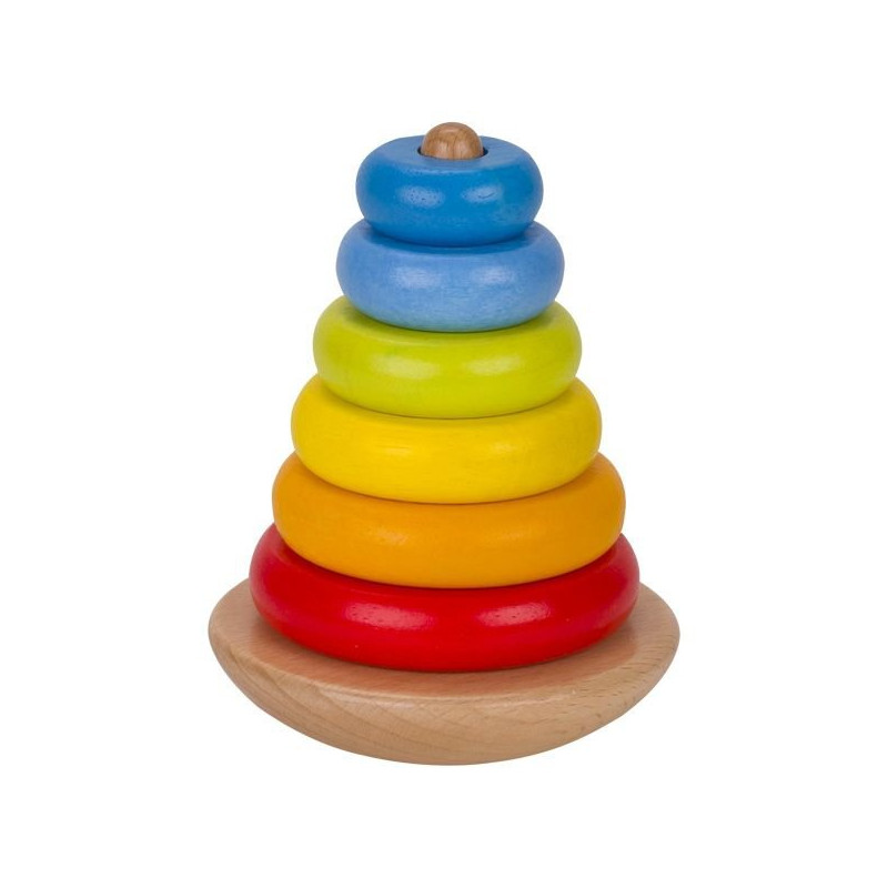 Balansująca wieże z pierścieniami jest tradycyjną zabawką zaproponowaną przez firmę Goki. Zestaw zawiera podstawę z palikiem oraz 6 krążków. Należy je układać od największego do najmniejszego tak, żeby tworzyły piramidkę. Dzięki temu dziecko ćwiczy motorykę swoich dłoni oraz koordynację ruchowo-wzrokową. Podstawa została specjalnie zaokrąglona. Jest to dodatkowe wyzwanie dla dzieci, ponieważ podczas układania buja się ona na boki. Całość wykonana jest z drewna, a pastelowa kolorystyka skutecznie zaciekawia dzieci. Zabawka dedykowana jest powyżej 2 roku życia.