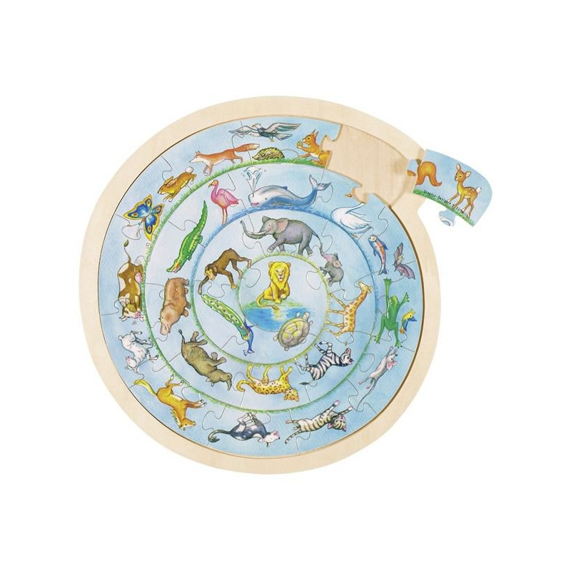 Doskonałą zabawką, która pomaga podczas nauki kojarzenia są puzzle. Wykonane są one z drewna, a na ich powierzchni znajdują się ilustrację zwierząt leśnych, domowych, wodnych oraz dzikich. Są one na tyle realistyczne, że bez trudu mogą posłużyć podczas nauki rozpoznawania tych stworzeń. Warto też wspomnieć, iż puzzle te są w pewnym stopniu nietypowe - układa się je na planie okręgu, nie prostokąta. Pozwala to na małą odmianę i z całą pewnością zainteresuje każdego małego miłośnika układanek! Informacje szczegółowe: