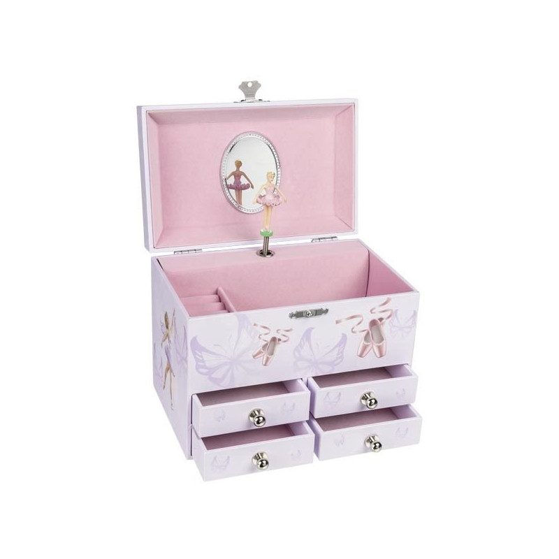 Szkatułka posiada aż cztery wysuwane szufladki, a także cztery szufladki u góry pudełka. To daje bardzo dużo miejsca na wszystkie drobiazgi.