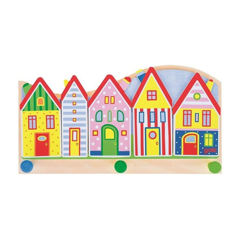 Wieszak przedstawiający kolorowe domki wykonany jest w całości z drewna, które zostało polakierowane. Posiada trzy kołki w różnych kolorach. Jest to niezwykle oryginalny wieszak, na którym dziecko z chęcią będzie wieszało swoje ubrania. Dzięki temu nauczy się, że każdy przedmiot ma swoje miejsce, również rzeczy, które ubiera się na spacer. Wieszak jest uniwersalny, dzięki kolorystyce oraz ilustracjom będzie pasował zarówno do dziewczynki, jak i chłopczyka. Montaż jest prosty i szybki, wystarczy wyłącznie użyć w tym celu dwóch kołków rozporowych. Opis szczegółowy: