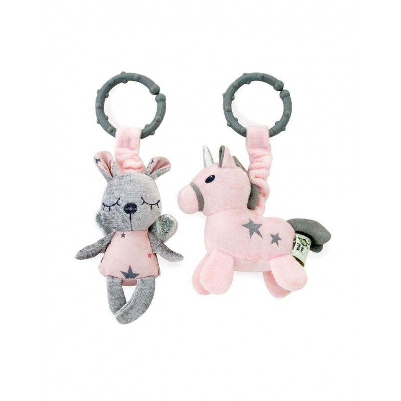 Zestaw Little Bird Told Me składa się z dwóch zawieszek: grzechotki wróżki Celeste oraz jednorożaca Fae z piszczałką w brzuszku. Przykuwające uwagę zawieszki zachęcają malucha do zabawy rozwijając jego wzrok, słuch i dotyk. Wykonane z miękkich, delikatnych i połyskujących tkanin są przyjemne w dotyku, idealne do chywtania przez małe rączki dziecka. Tkaniny oraz haftowane gwiazdki pobudzają stymulację dotykową noworodków. Dodatkowe uchwyty z wypustkami pomogą złagodzić ból dziąsełek u niemowląt podczas ząbkowania. Pierścienie z wypustkami nie tylko złagodzą ból dziąsełek, ale również posłużą do przymocowania przytulanek do fotelika samochodowego, łóżeczka lub wózka. Zawieszki to idealne przytulanki dla niemowlaka, który będzie mógł się bawić, dotykać, chwytać i przytulać. Zestaw idealny do zabawy w domu, podczas podróży czy codziennych spacerów.