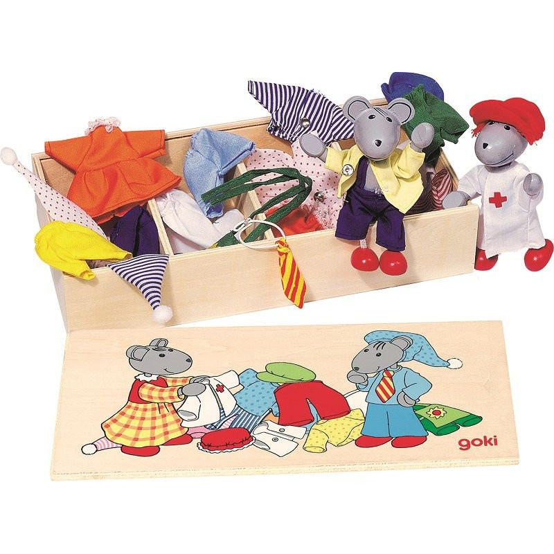 Zabawka Myszki do ubierania to świetny pomył na dobrą zabawę. Zestaw zawiera dwie drewniane myszki oraz akcesoria potrzebne do ich ubierania czyli kilka par spodenek, czapek, bluzek, sukienek, krawat, kamizelkę, fartuszek do gotowania i fartuch lekarski. Różnorodność wyboru sprawia, że rozwija się wyobraźnia dziecka, które samo może wybrać odpowiedni strój. Zabawka również świetnie rozwija sprawność rąk. Ręce oraz nogi myszek wykonane są ze sznurka. Do zestawu dołączone jest również specjalne zamykane pudełeczko, które posiada cztery przegródki do łatwiejszego segregowania. Zabawka jest dedykowana dla dzieci powyżej 3 roku życia.