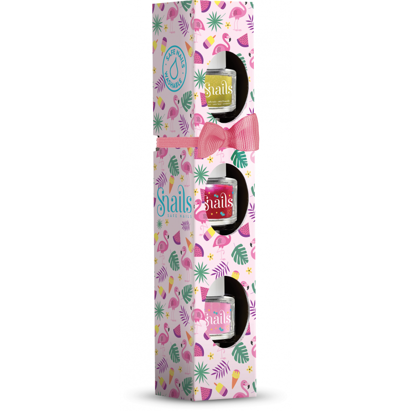 Zestaw 3 lakierów do paznokci marki Snails. Lakiery są całkowicie zmywalne oraz spieralne. Wystarczy umyć rączki wodą z mydłem aby zmyć kosmetyk bez potrzeby użycia zmywacza z acetonem. Trwałość lakieru można przedłużyć do 2 dni używając utwardzacza Top Coat. Kolorowa gumka z opakowania może być użyta jako bransoletka.